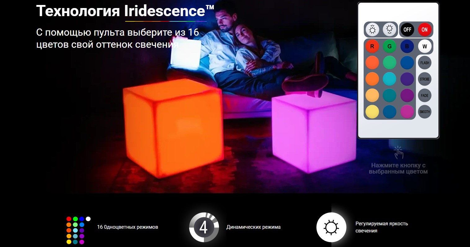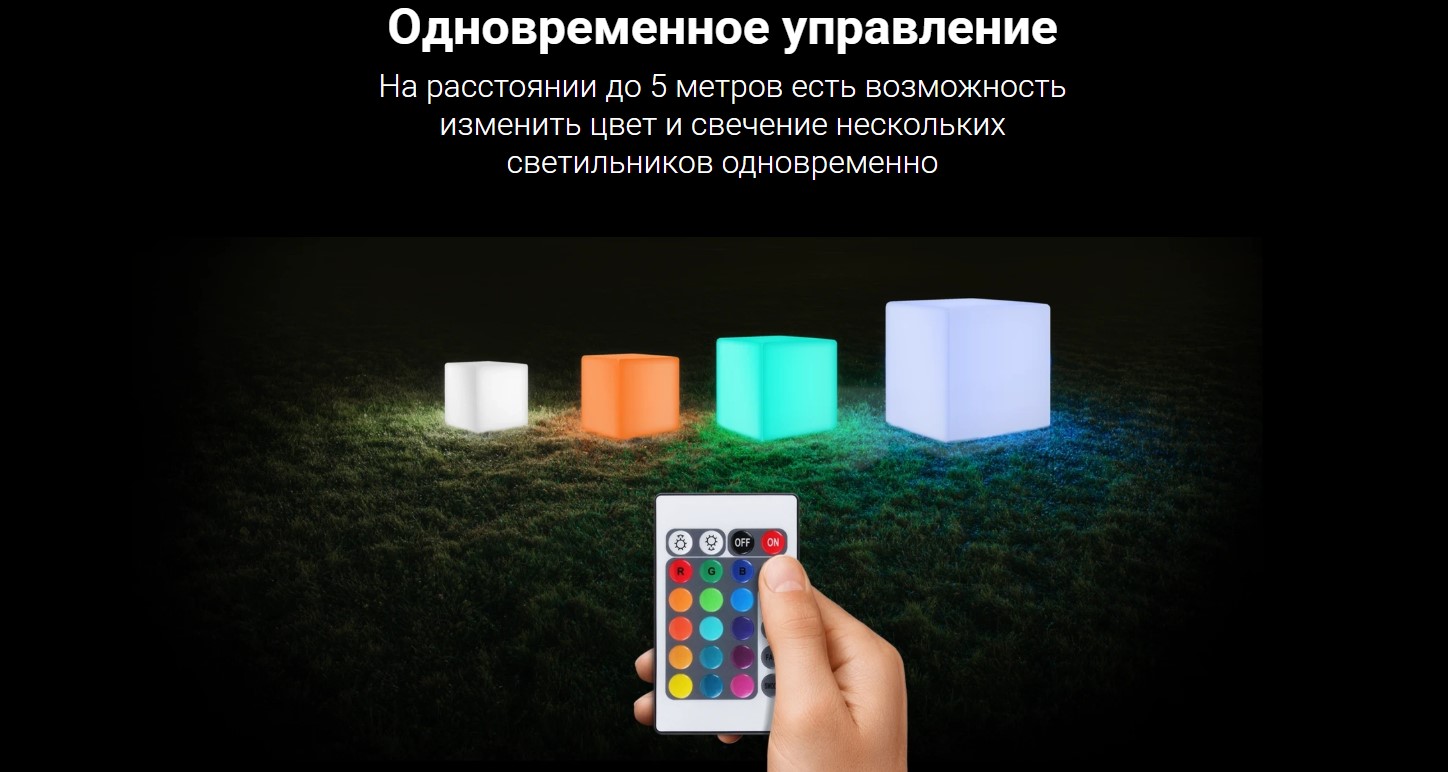 Светящиеся кубы обладают защитой водонепроницаемости IP68, что позволяет им функционировать как внутри, так и снаружи помещения, в любую непогоду, включая осадки: дождь, снег и т.д.